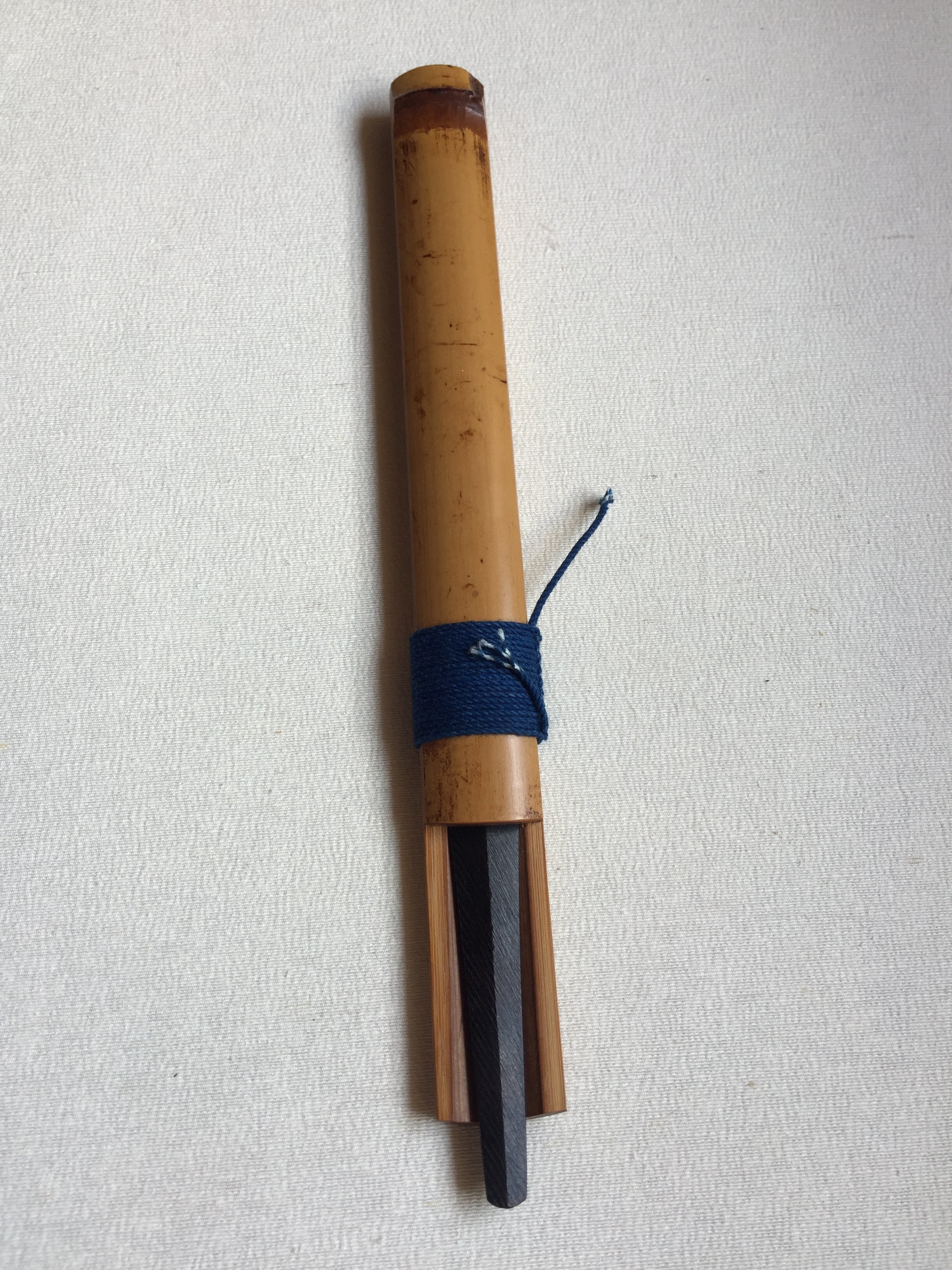 また 鞘には日本の古民家で長い時を経た貴重な「煤竹」をつかい製作、日本の色である藍染めの糸を 鍛冶仕事に使う道具に結うむすびであしらいました