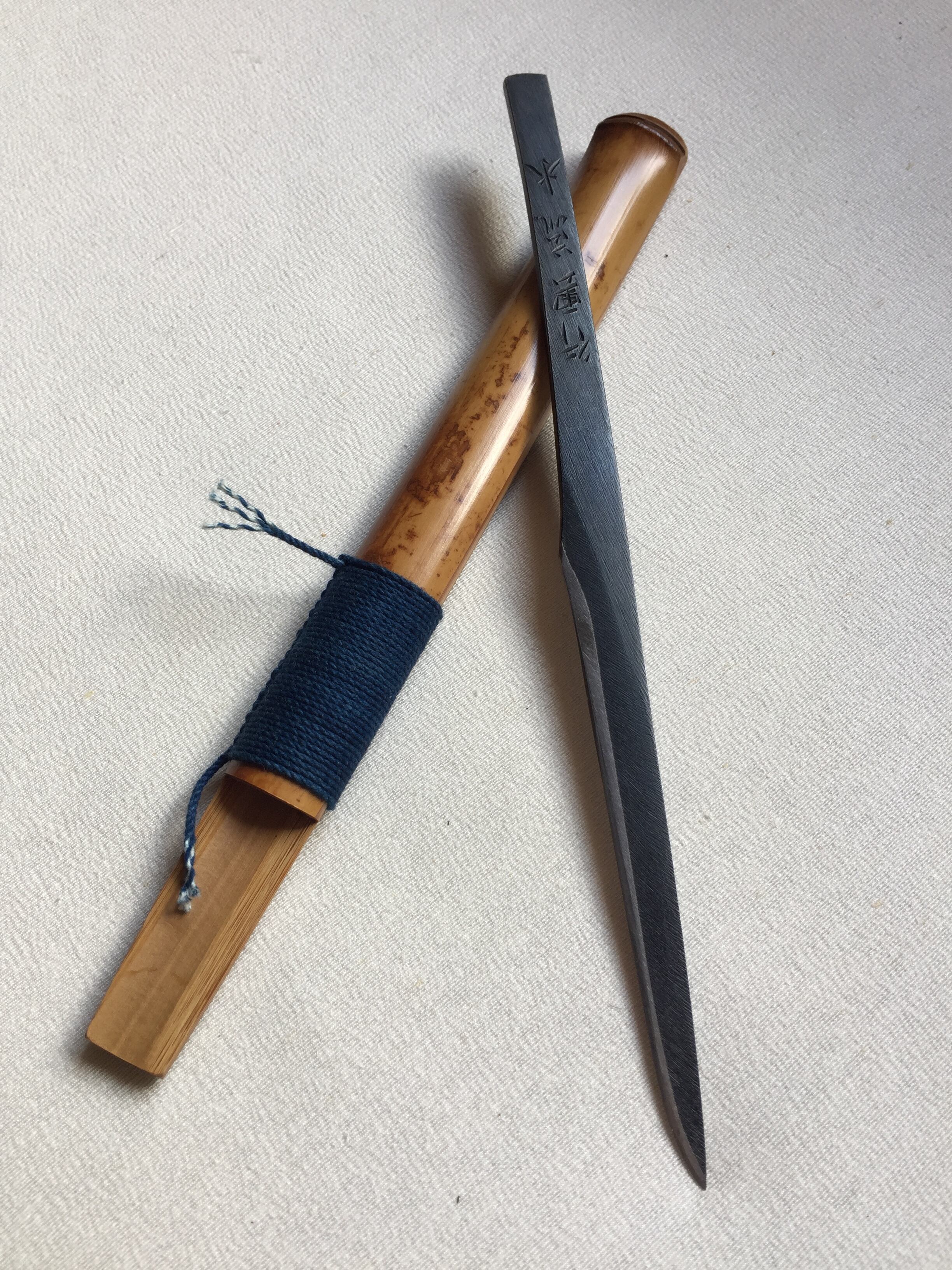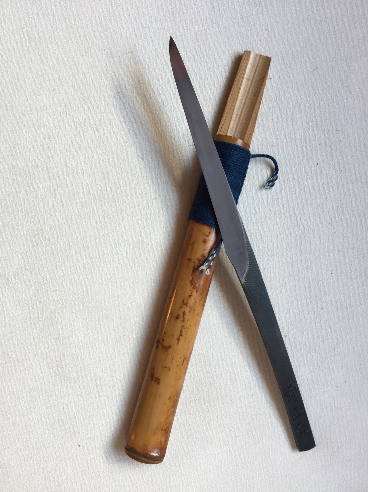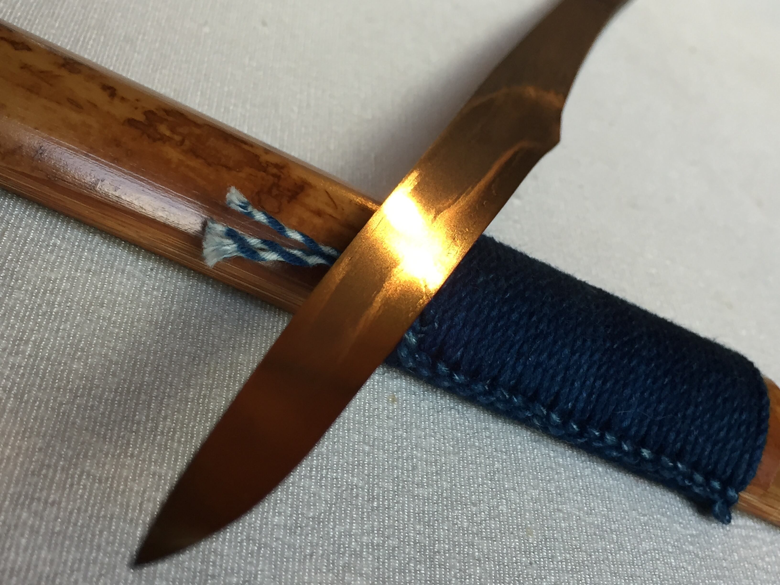 また 鞘には日本の古民家で長い時を経た貴重な「煤竹」をつかい製作、日本の色である藍染めの糸を 鍛冶仕事に使う道具に結うむすびであしらいました