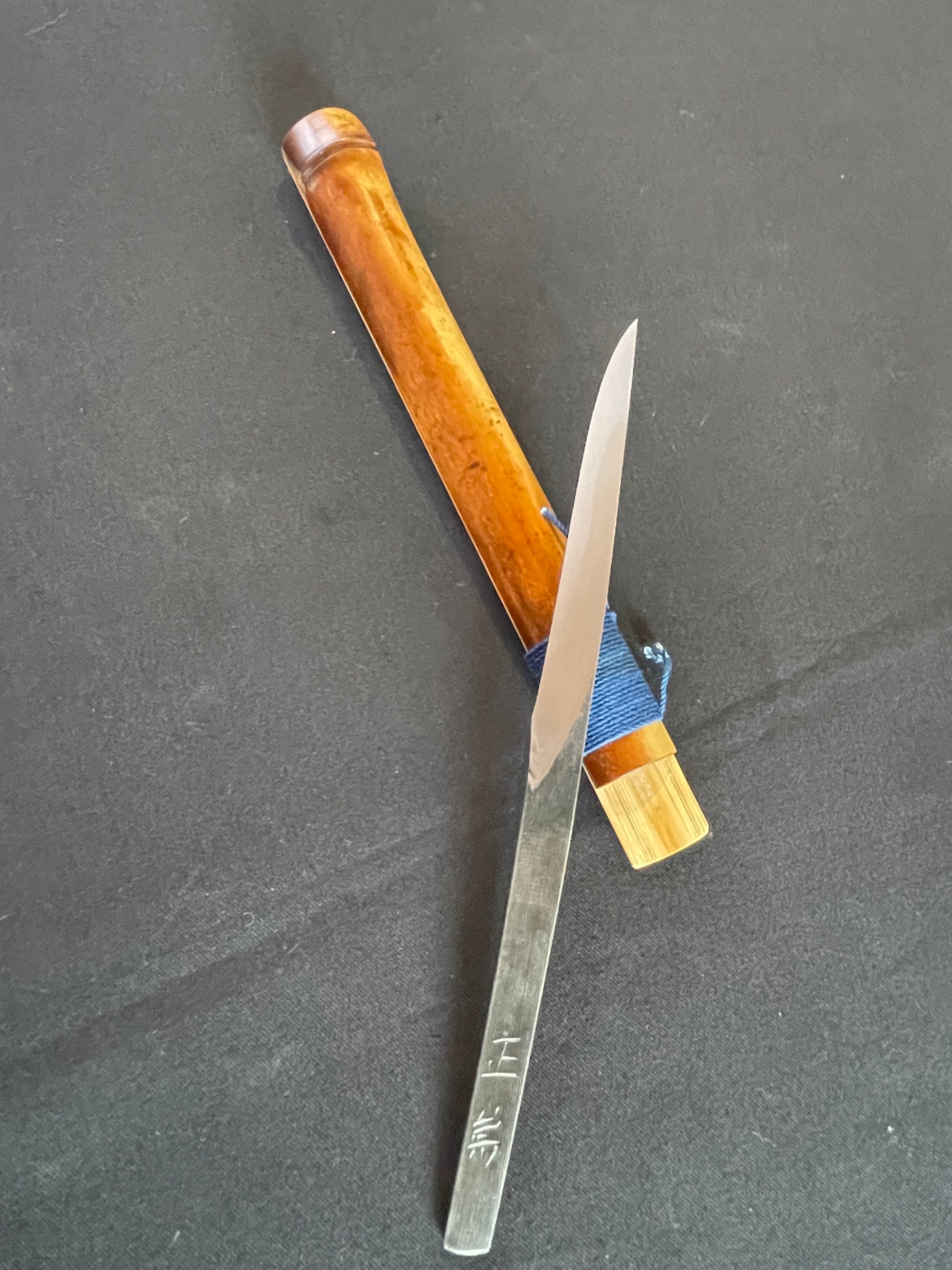 また 鞘には日本の古民家で長い時を経た貴重な「煤竹」をつかい製作、日本の色である藍染めの糸を 鍛冶仕事に使う道具に結うむすびであしらいました