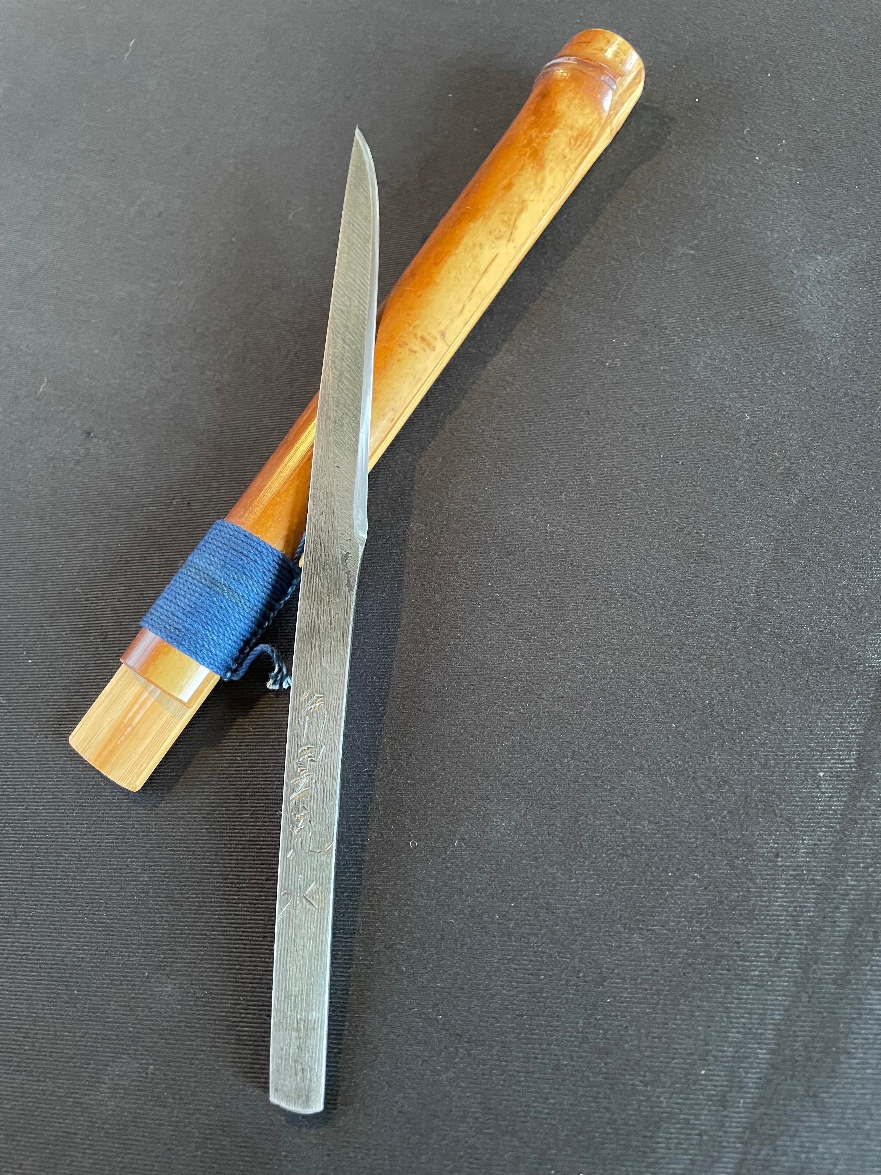 The sheath is made of precious ‘soot bamboo’ that has been in an old Japanese house for a long time. The sheath is made of ‘sooty bamboo’, a precious material that has been used in Japanese old houses for a long time, and is decorated with indigo-dyed thread, the colour of Japan, in the form of a musubi knot on the tool used for blacksmithing.