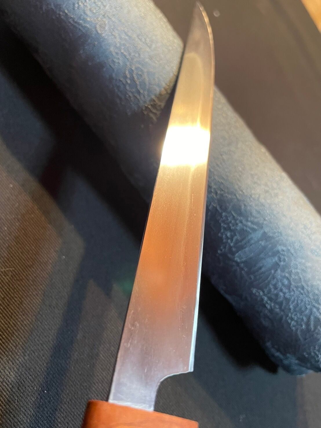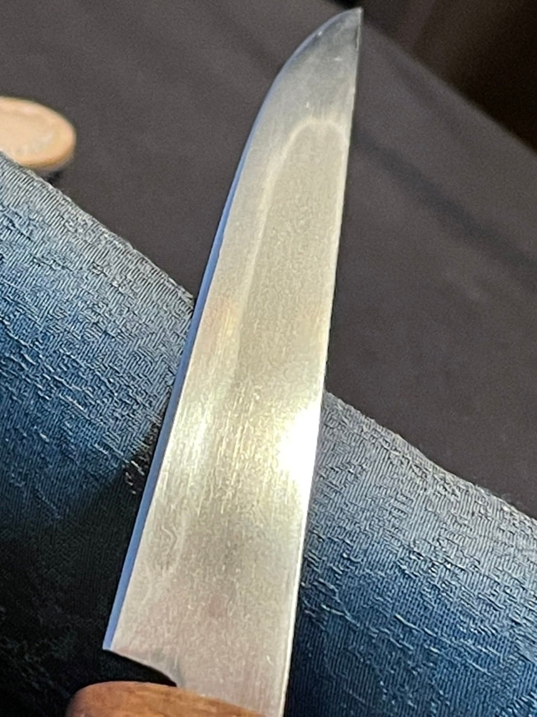 研ぎに関しては鏡面の仕上げなど機械研ぎはしないで、天然砥石を用いて自然に地鉄や焼刃が見えるようにこだわり研いでおります